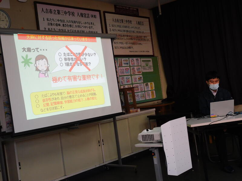 人吉警察署生活安全課及び防犯協会からお越しいただき、「薬物乱用防止教室」を実施しました。大麻等の薬物に関すること、現在社会問題になっているSNSや闇バイトについてお話をしていただきました。正しい知識を身に付け、毅然とした態度で対応できるようにしてほしいと思います。
