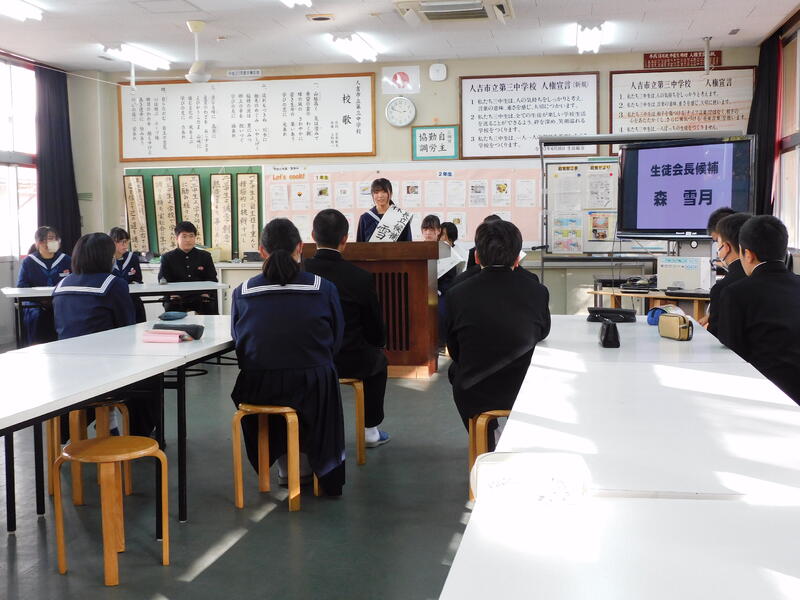 次年度生徒会役員候補者による「立会演説会」を実施しました。冒頭に選挙管理委員長から、「次のリーダーを選ぶために一人一人の一票に価値がある」との話があり、4名の候補者及びその応援者の話をしっかり聞いていました。12日(木)に開票され、13日(金)に発表されます。