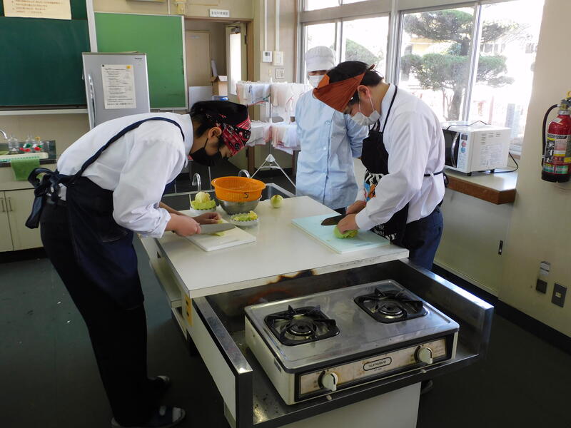 家庭科の学習で「調理実習」を行いました。その中で、「キャベツの千切り」の実技テストもありました。普段から家庭で調理をしている生徒の包丁さばきは見事でした。