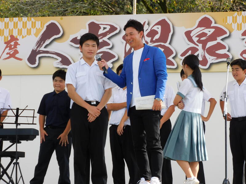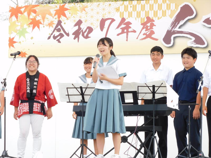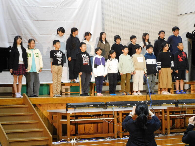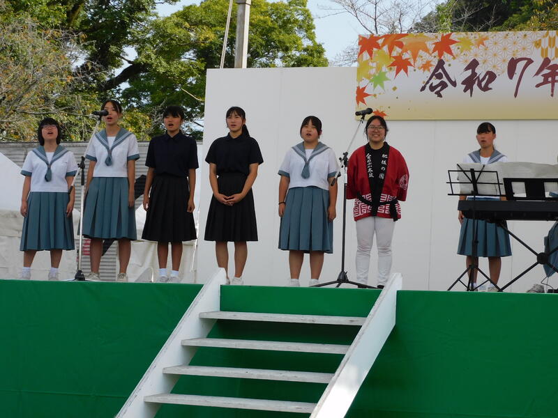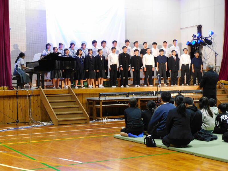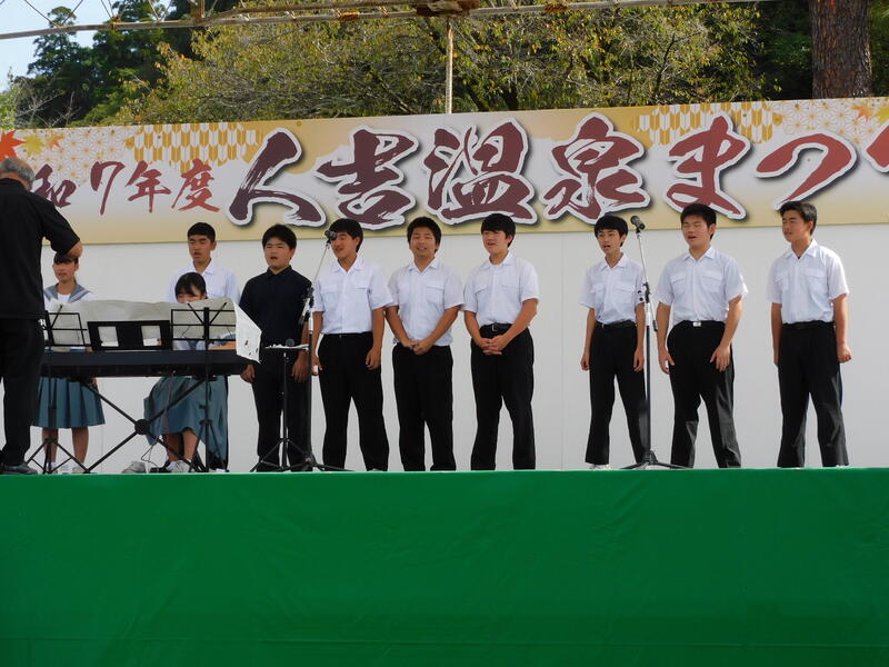 ひとよし温泉祭りに参加しました。当日は16名で参加し、「青い鳥」、「旅立ちのとき」の2曲を合唱しました。村田先生の指導のもと、これまで練習した成果を発揮し、美しい歌声を披露してくれました。