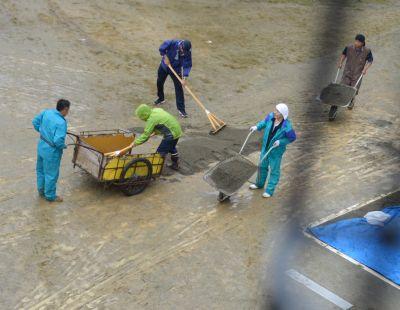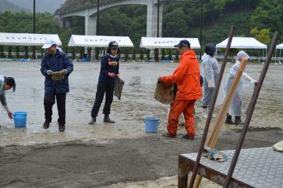 前日からの雨で、運動場も水浸し。保護者や地域の方々により、早朝からグラウンド整備をしていただきました。