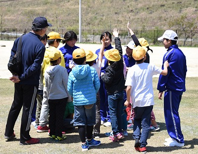 中学生がリードしてレクリエーションのチーム分けをしています。