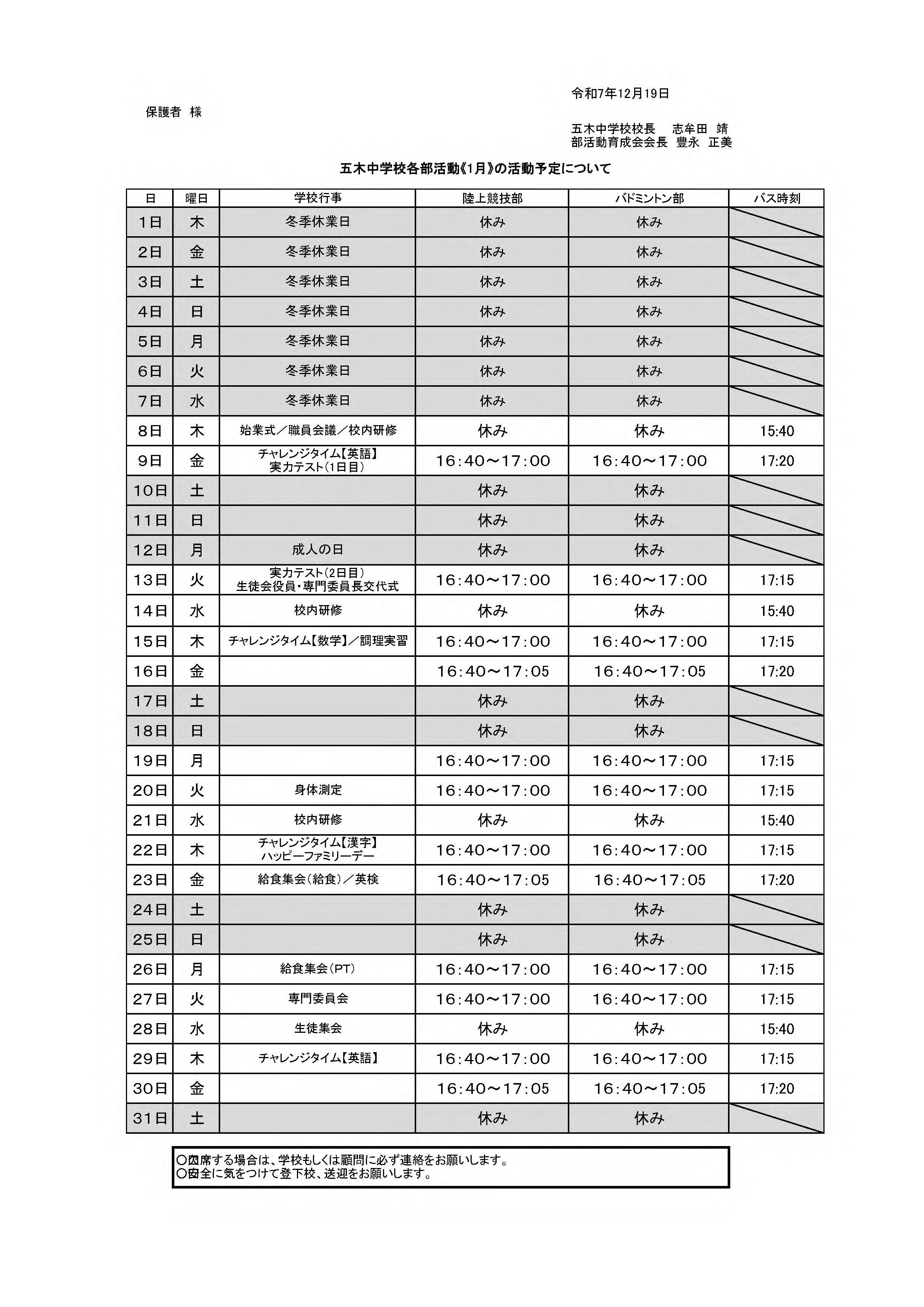 ●令和7年度 1月の部活動予定