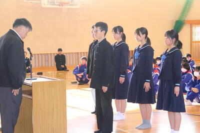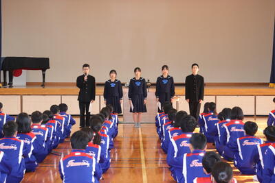 「生徒会役員任命式」では、11月の選挙・投票によって当選した会長1名・副会長2名・書記2名に、校長先生より任命状を授与していただきました。そして5名を代表して新会長が、力強く意気込みを発表しました。