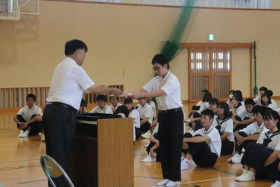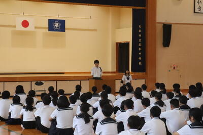 校長先生からは、1学期の頑張りについてお話がありました。中でも地域ボランティアへの生徒の積極的な参加に対する感謝の気持ちや「人を喜ばせること、幸せにすることが自分の幸せにもつながる。今後もぜひボランティアに参加してほしい」との話をされました。