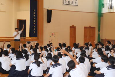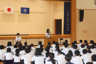 生徒指導担当からは、「2学期モードに切り替えるために『①あいさつ・返事をしっかりする、②時間を守る、③整理整頓、身の回りを整える』の3つを意識して生活するように」ということ、保健担当からは、「①生活リズム、②感染症対策、③熱中症予防、④歯磨き」について話がありました。