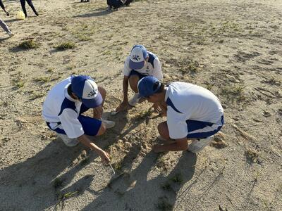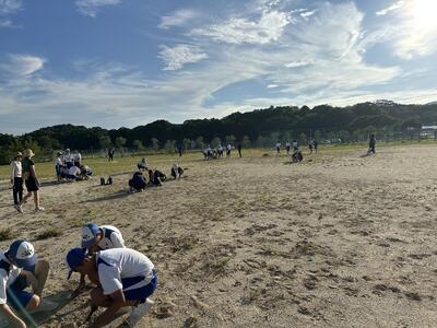 夏休みに大きく成長したグラウンドの雑草たちと格闘する生徒たち、強く根を張っており苦戦する姿も見られましたが、友達と協力して取り組んでいました。保護者の皆様も、草刈り機で豪快に刈ってくださったり、生徒たちのそばで一緒にコツコツと抜いてくださったりと、短時間でしたがたくさんの雑草を除去することができました。夏休み中と比べると地面が見える部分が多くなり、運動部や陸上の練習に集中できる環境になったと思います。