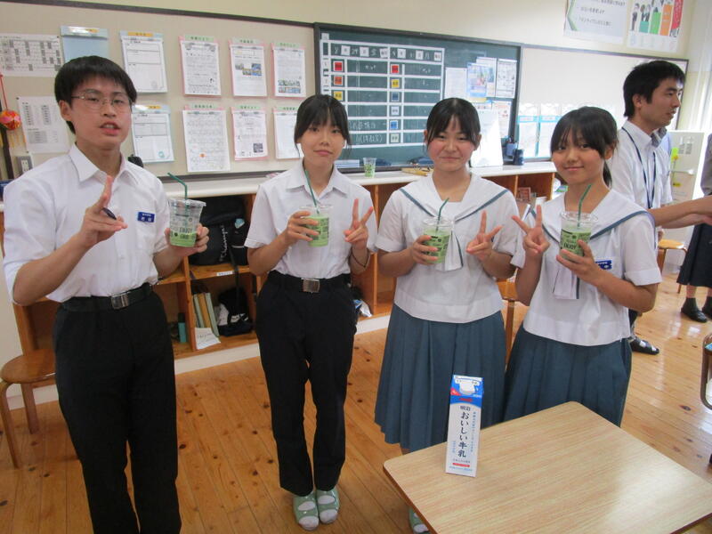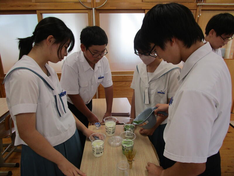 お茶農家で保護者でもある、坂田さんが作られた抹茶を使い、材料の分量、お茶の風味や甘さなど、どうやったらおいしくなるかを中学3年生が研究して考案しました。