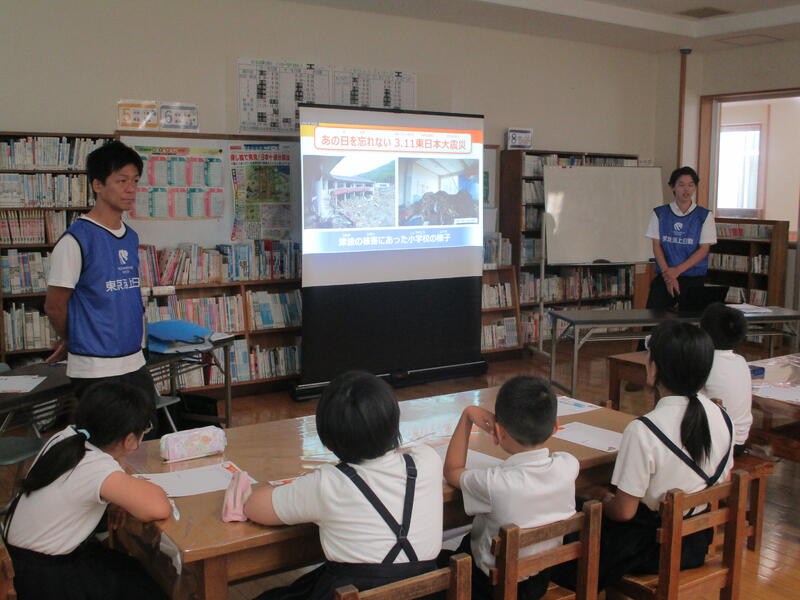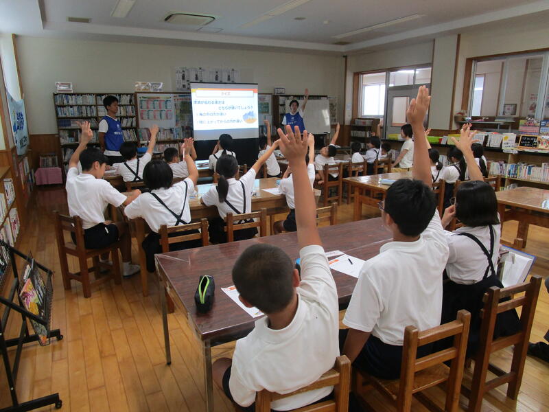 9月2日(火)、東京海上日動の松下さんと朝野さんをお招きし、小学生を対象に「防災(地震や津波)出前授業」を行っていただきました。
