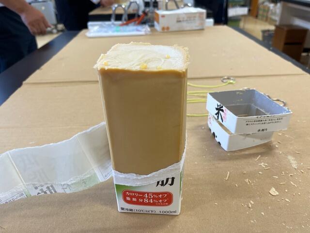 今日は、10日に仕込んでおいた牛乳パックを取り除いて、廃油石けんを切る作業です。