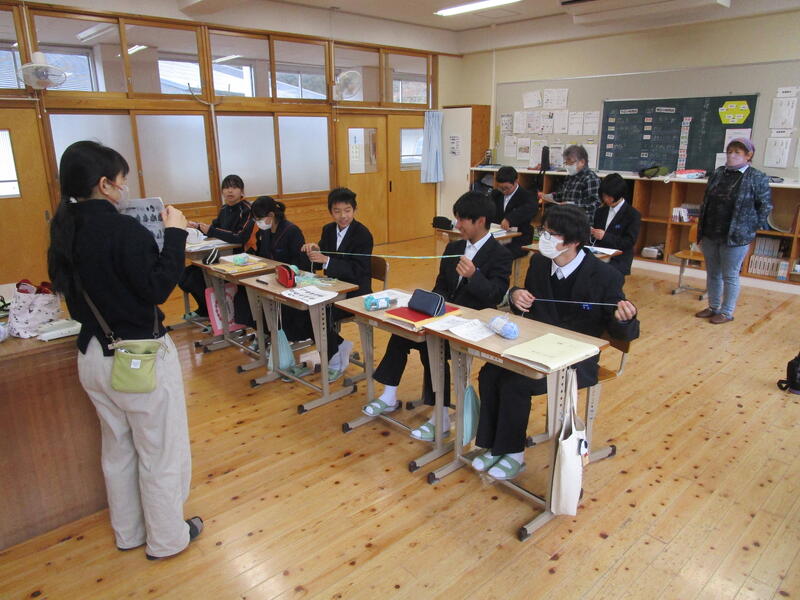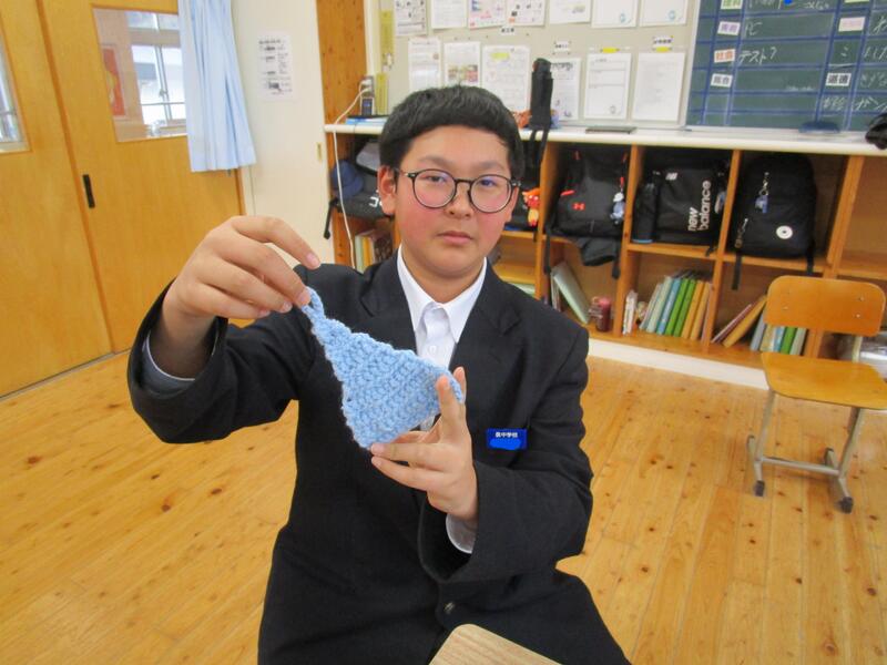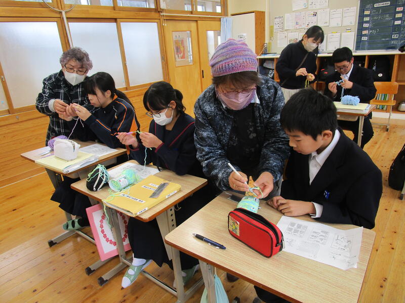 生徒は悪戦苦闘しながらも、集中して毛糸を編んでいました。