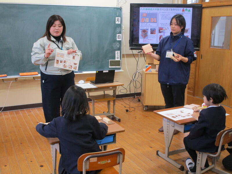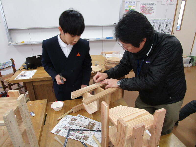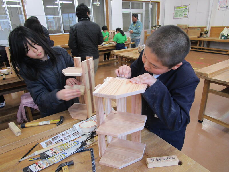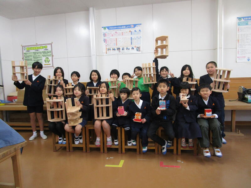 小学1~6年生が参加し、1・2年生は「ペン立て」、3~6年生は「コーナーラック」を作りました。