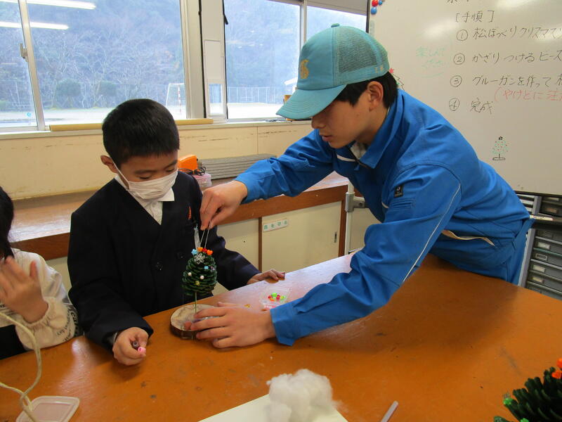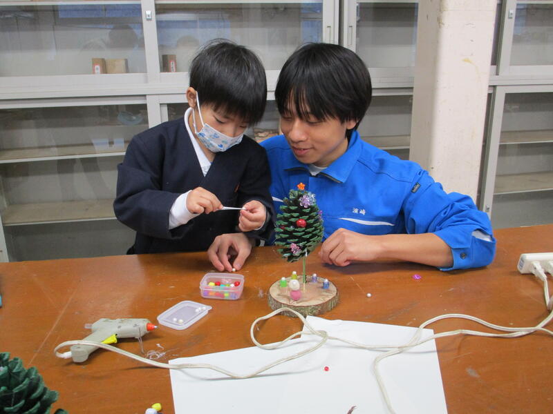 その後、高校生のお兄さんお姉さんに教えてもらいながら、小学生は夢中でツリーを作りました。