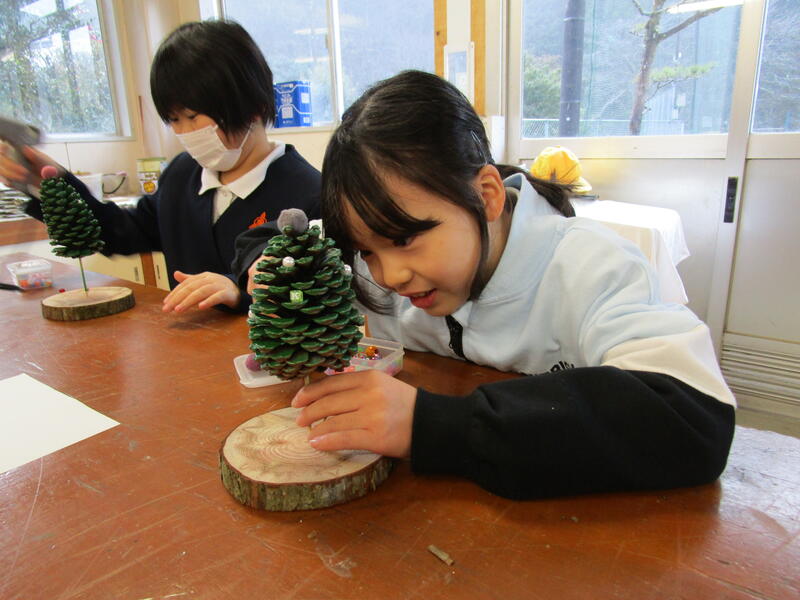 今日のネイチャークラフトの内容は、松ぼっくりを使ったクリスマスツリー作りです。小学生は、ワクワクしてこの日を待っていました。