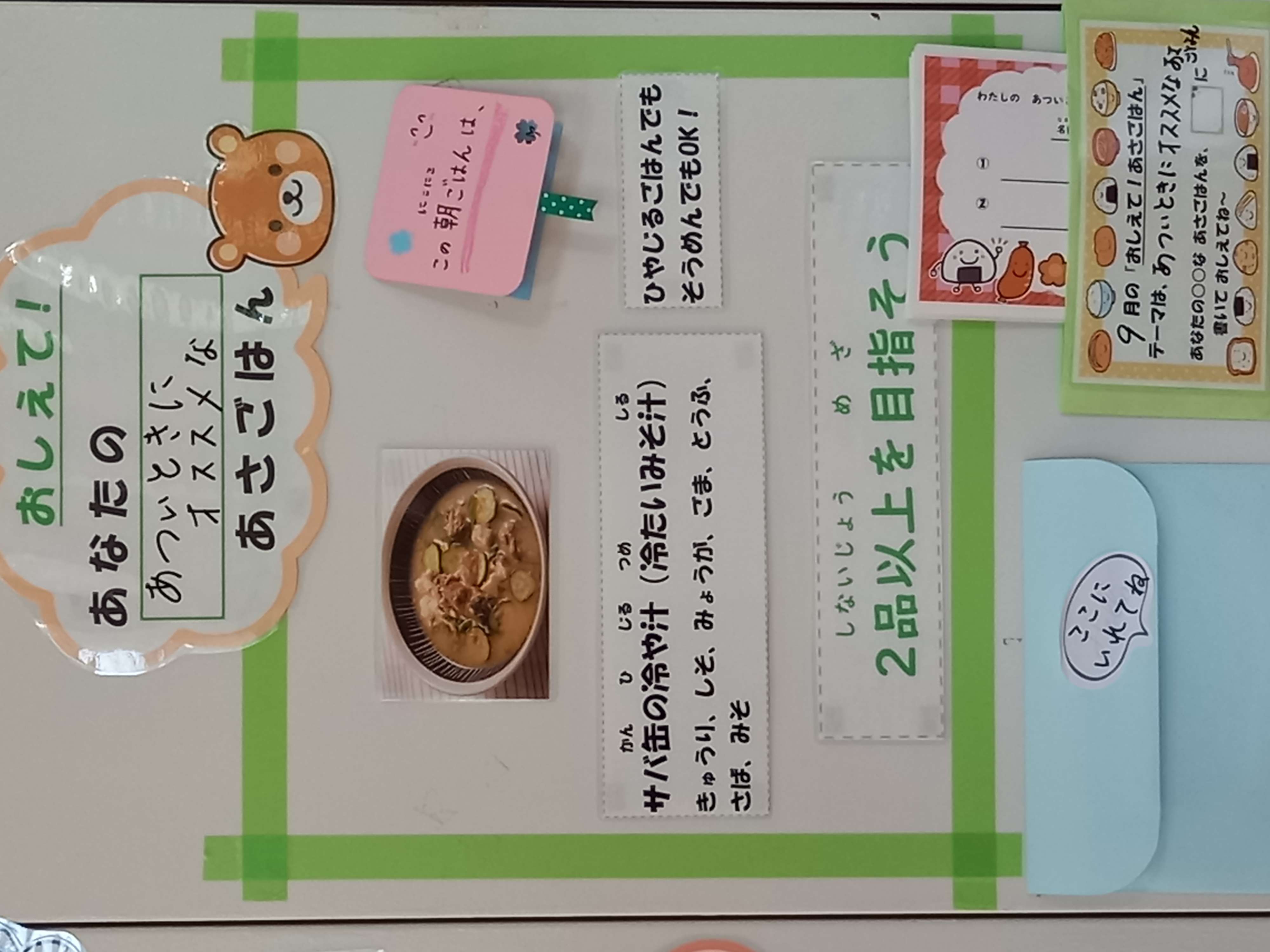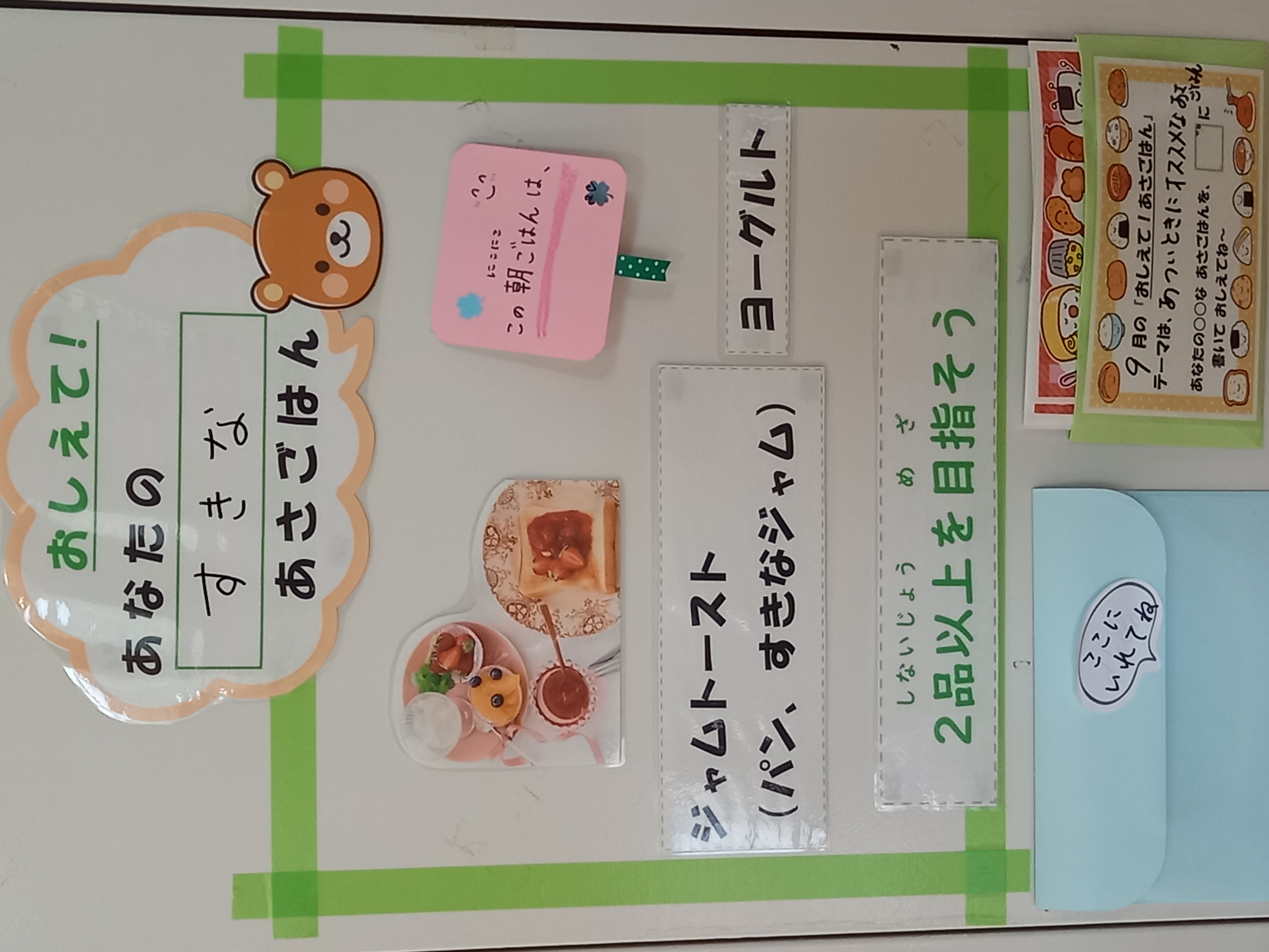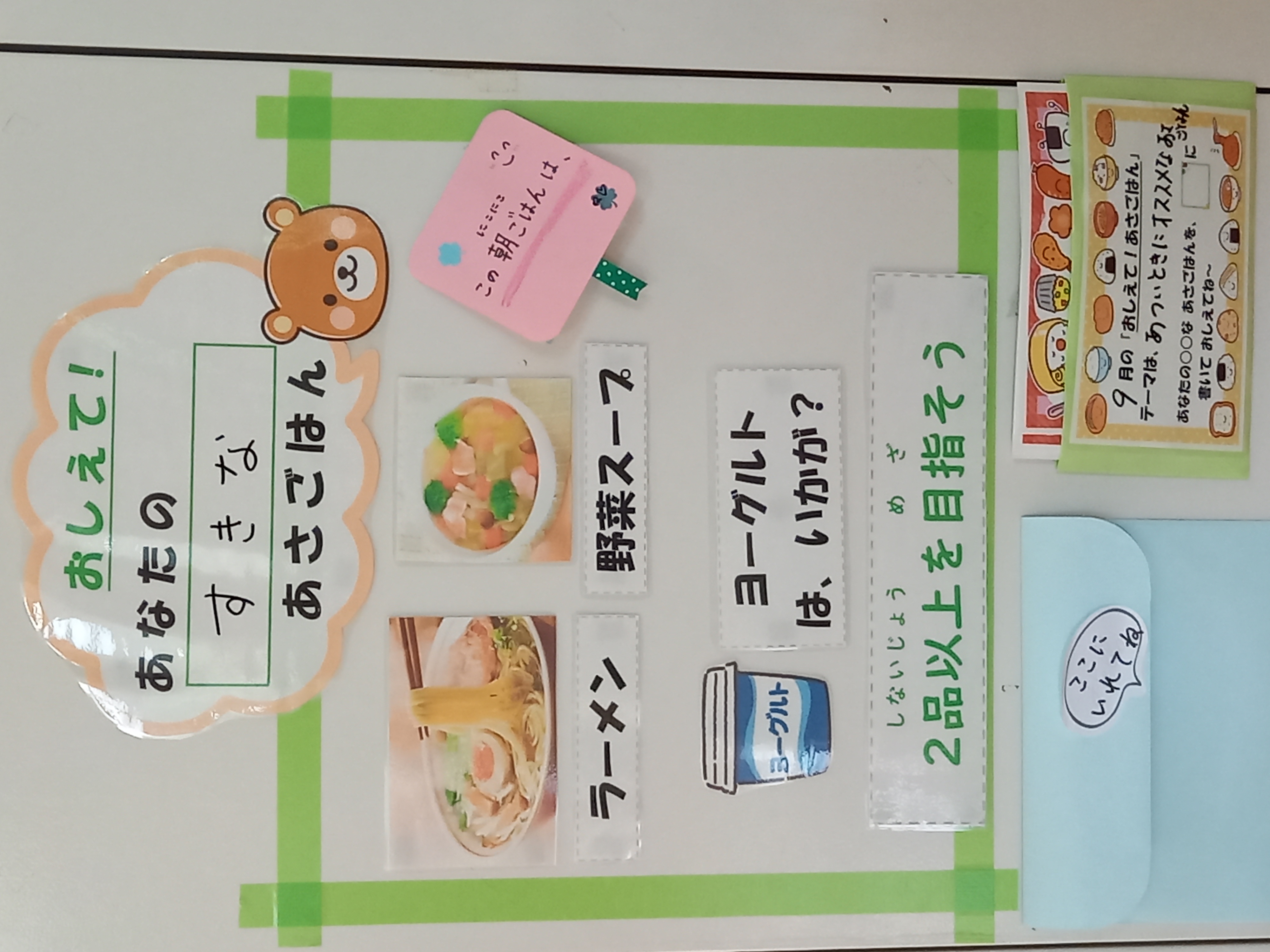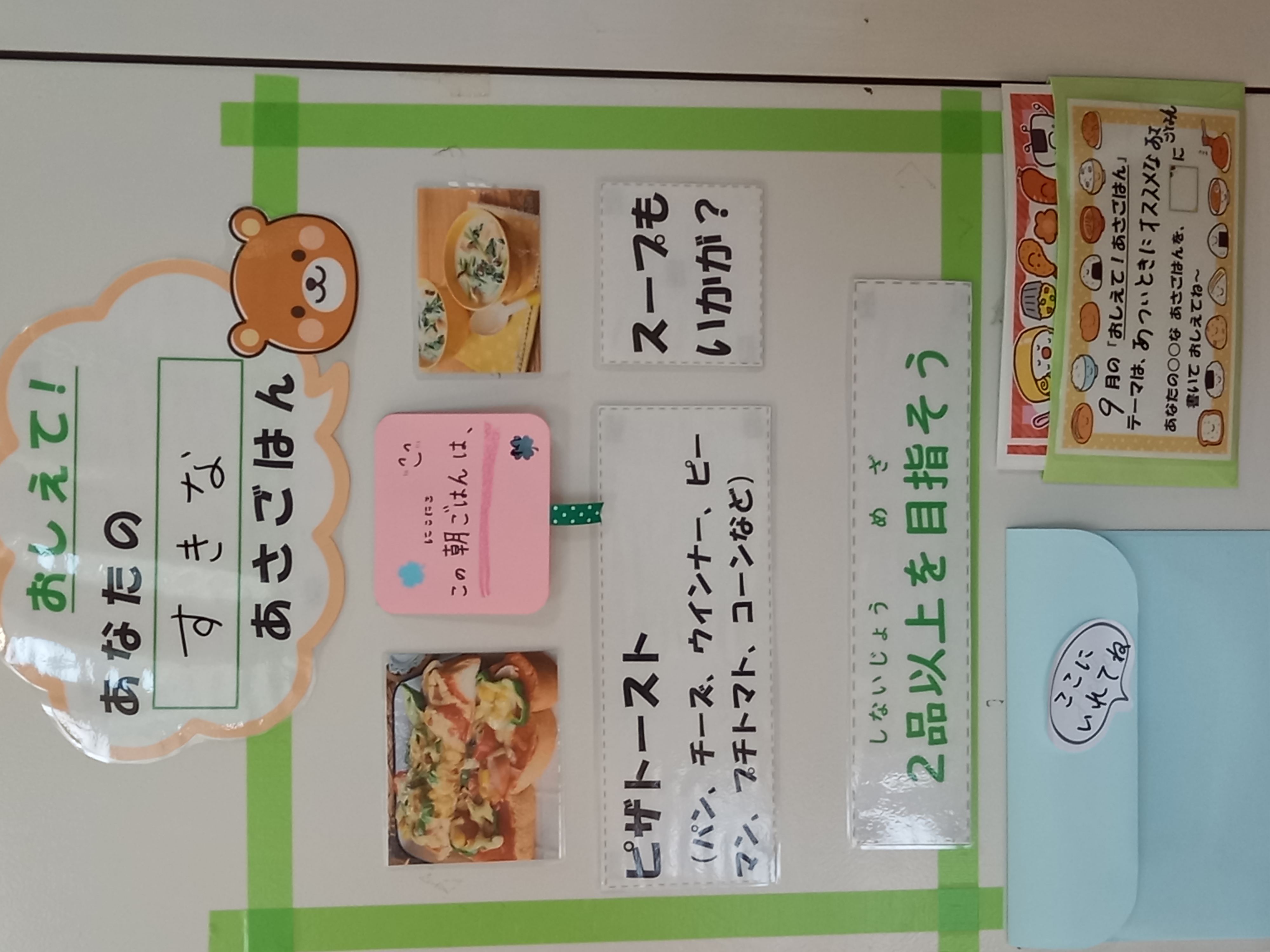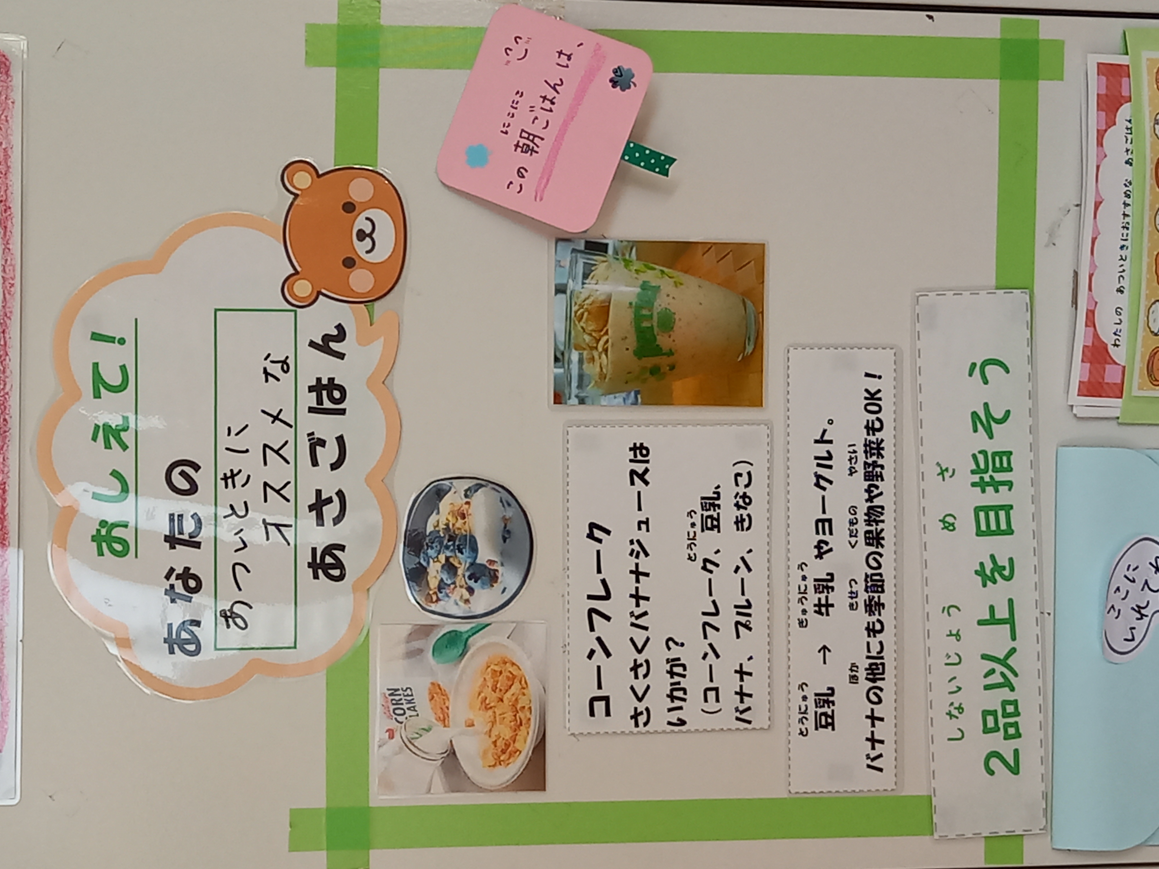 今年度は、朝ごはんを中心にいずみん大作戦を進めていきます。子どもたちに朝ごはんについて考えてほしいと思い、朝ごはんコーナーを保健室前に作りました。テーマは月ごとに変わります。ぜひ、あなたのな朝ごはんについて教えてください!!