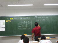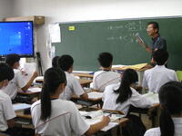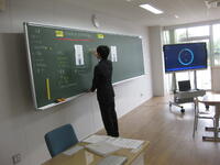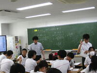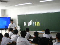 1年生の英語では、「あの人の好きなことを伝えることができる。」というめあてのもとで、めりはりをつけながら学習を進めていました。数学では、方程式を利用して問題(み・は・じ)を解くために、み(みちのり)・は(はやさ)・じ(時間)の関係を復習し、スモールステップで一次方程式を解いていました。