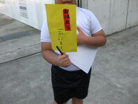 一方、東門ではあいさつ運動をしている小学生の一人が、黄色い紙に「おはようございます。」と自ら書いたあいさつカードを登校している小中学生に提示して、あいさつ運動を展開していました。登校している児童生徒の目を引くとともに、あいさつしている職員や子どもたちにも活気があふれた時間となりました。(文責 高田)