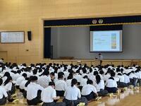 後半は、これからの進路選択に関わる流れを進路指導主事が説明しました。熊本県内の公立高校の出願がWeb申請に代わることに伴う登録や手続きの流れを資料を用いて丁寧に説明しました。