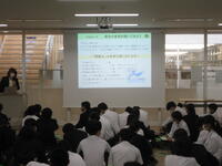 前半は、本校卒業生3名から進路選択の理由や勉強の方法、心構え、学校生活の様子などを話していただきました。