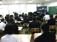 後半は、これからの進路選択に関わる流れを進路指導主事が説明しました。熊本県内の公立高校の出願がWeb申請に代わることに伴う登録や手続きの流れを資料を用いて丁寧に説明しました。