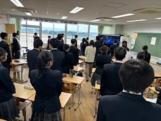 本日(9日)の1校時、冬休み明け集会を行いました。今回も寒さに配慮してオンラインで行いましたが、冒頭には能登半島地震や羽田空港の航空機事故の犠牲になられた方々の冥福をお祈りし、黙祷を捧げさせていただきました。