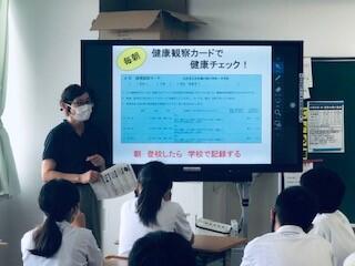 内容的には、これまでの基本的な感染予防対策の徹底に加え、自らの健康観察の重要性、特に体調に異変かあったり家族等に感染の恐れがあったりする場合は、用心して登校を控えること等の説明がありました。