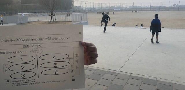 「みんなの玄関」から運動場を写しました。一旦は外遊びを禁止していた小学校ですが、再び外遊びをしてよいこととなりました。それは、外遊びを禁止してしまうと、結局、密になった教室の中で遊んでしまうからです。そのため、映り込んでいる図のように(小学校の森田教務主任に持ってもらっています)、場所を決め、運動場を広く使って遊ぶこととなったそうです。
