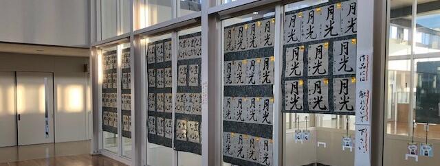 3階西側の展示スペースでは、現在、合志市文化祭の書道作品のうち優秀(金賞)作品が展示されています。本校舎には3階に図書室の吹き抜けを挟んで東西2カ所に展示スペースがありますが、実際に貼り付けているのは、写真のとおりガラス窓です。せっかくのスペースを有効活用するため、展示用パネルボード等も今後少しずつ整備していきたいと思っています。