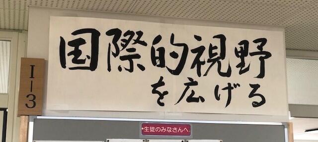 3階廊下の柱に「国際的視野を広げる」という掲示をしました。文字は、書道の達人である 橋爪 養護教諭に書いていただきました。