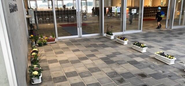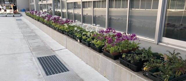 みんなの玄関には、パンジー、金魚草、葉ボタン等のプランターがきれいに並べられています。これは、小学校・中学校兼務の用務員の田尻先生が大切に育てられているものです。また、別の場所では、チューリップやサクラソウもたくさん養生中です。これらは、卒業式や入学式の会場を華やかに飾ってくれることでしょう。