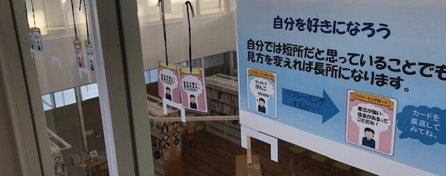 3階の西側ギャラリー(展示スペース)のガラスには、「リフレーミングカード」が掲示されています。このことについては、ほけんだより(2月号)に記載がありますので、詳しくはそちらを読んでいただければ思いますが、簡単に言えば「気持ちは持ち様」。例えば「頑固」と言われれば短所と思われがちですが、それは「意志が強い、信念がある」という長所ととらえることもできるということです。