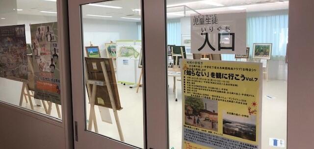 本日も、菊池恵楓園絵画クラブ「金陽会」作品展「知らないを観に行こう」を開催している地域交流室を撮影しました。昨日(23日:祝)は、一般公開され、多くの方々に観覧していただきました。その詳細は小学校のHPに掲載されてますのでリンク(ここをクリック)しておきます。副知事もご夫妻でお見えになっていたとのこと。ハンセン病問題の啓発に、本校の地域交流室が一役買えて良かったなと思います。また、今回の展示会を主査していただきました小学校に感謝するとともに、小中一体型の校舎である良さも改めて感じたところです。