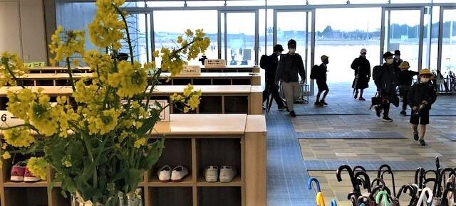 菜の花を前景にみんなの玄関を撮影しました。「中学生が入るように」と思いシャッターを切りましたが、よく見ると小学6年生でした。体格はもう十分中学生。本校の場合、中1ギャップも小さいと思われますので、あとは中学校の制服を着せるだけです。