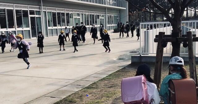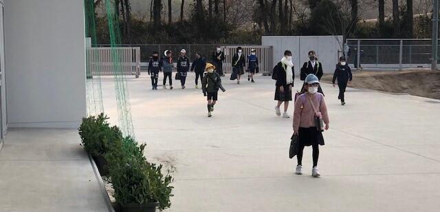 芝生広場から東門付近を撮影しました。この時は掃除時間で、小学生は掃除をしていますが、中学生は午前中授業、給食無しで下校です。