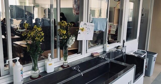 3階廊下から、各教室前にあるシンクを撮影しました。シンクの上には、本年度始めに熊本菊南ロータリークラブから寄贈いただいた花瓶に花を生けています。今は「菜の花」を生けていますが、坂本 教諭がいつも「水切り」をしてくれているので、「水揚げ」が良く長持ちしています。