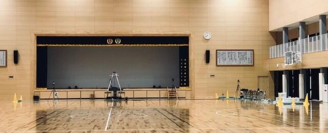 すでに周知させていただいているとおり、本日の午前中、学習成果発表会をオンライン(ライブ)で実施します。その発表会場の体育館ステージの様子を撮影しました。