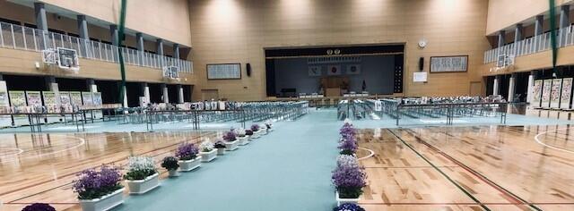 記念すべき合志市立合志楓の森小学校第1回卒業証書授与式の会場準備か整った体育館を撮影しました。開式は10:00となっています。