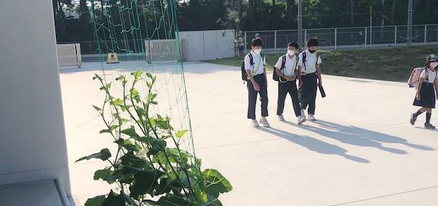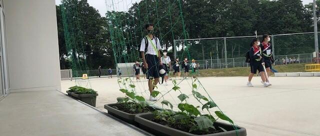 職員室前から緑のカーテン用のプランターを前景に東門方向を撮影しました。