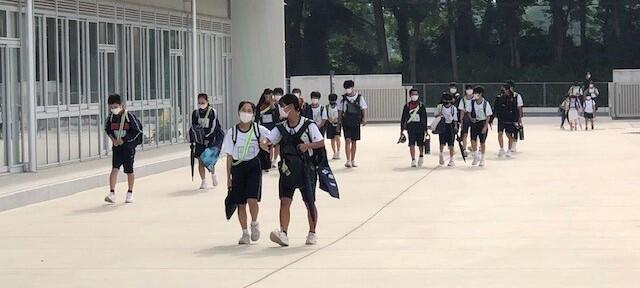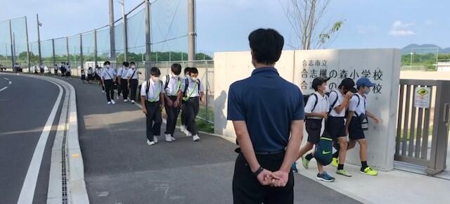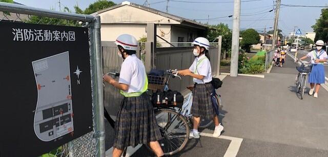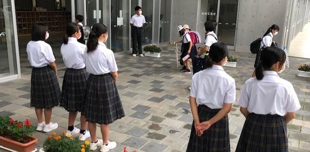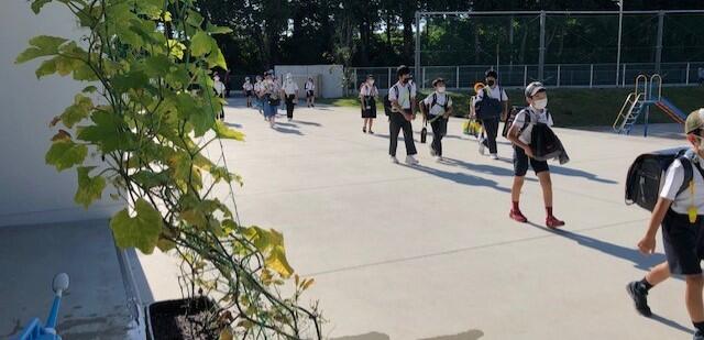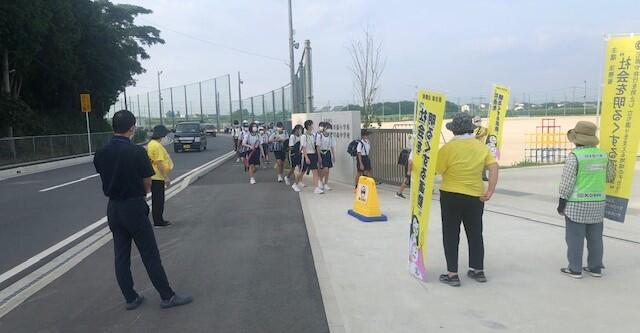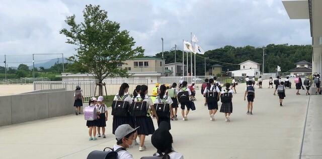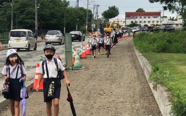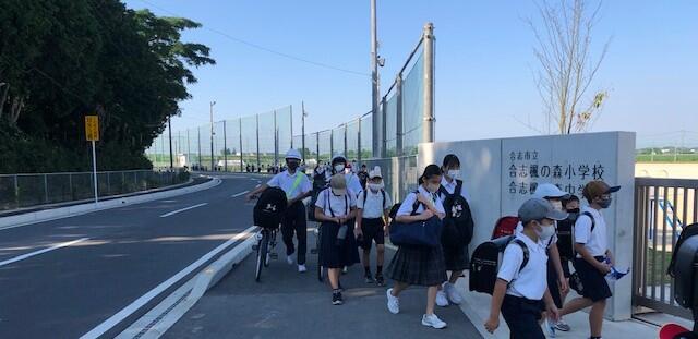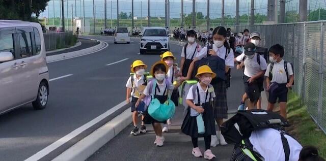 小学生・中学生が入れ混じって登校するのも日常の光景ですが、子供たちがマスクを着けて登校するのも日常の光景となっています。しかし現在、とりわけ夏季は、新型コロナウイルス感染症対策よりも熱中症対策を優先するよう文部科学省等から指導があっており、おしゃべりをしなければ、登下校時はマスクをはずしてよいことになっています。ただ、登下校時は友達とおしゃべりしながら歩きたいのでしょうか。マスクを外している子供は見かけませんでした。