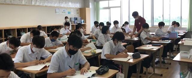 なお、こういう場面では、松本 先生が担任する2組は、副担任の 渕上 先生が入っています。本校では「学年担任制」を敷いていますので、学年主任・副担任や他学級の担任を含め、学年部職員全員で学年の生徒全員をみていく体制にしています。