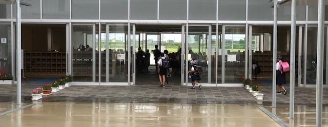 東門に立って、黒石原方面から登校してくる児童生徒を撮影しました。本日の予想最高気温は37℃。もうこの時間でも相当暑いです。しかし、よく見るとテニスコートの横から東門までの歩道は日陰です。菊池恵楓園の森が強い日差しを遮ってくれています。これも「楓の森」の恵みですね。