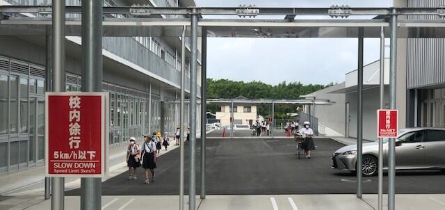 合志の道の体育館・武道場のから「みんなの玄関」への渡り廊下を撮影しました。令和3年度よりも小・中学校の教職員数が増加したことを受け、校舎(特別教室棟)と体育館・武道場との間のアスファルト敷設スペースにも、職員の自家用車を駐車してよいこととしました。しかし、心配なのは児童生徒と動線が重なることです。対策として、ここへの駐車は、朝の7:20まで出勤した自家用車に限定。また、中学校の教員業務支援員の 豊田 先生に「校内徐行 5Km/h以下(SLOW DOWN Speed Limit 5Km/h)」の掲示を校地内各所に設置していただきました。