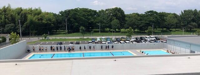 3階のもみじ2組教室のベランダからプールを撮影しました。本校のはプールは外から見えないよう壁で囲ってあります。この写真もその辺りを意識して、相当引いて撮影しました。