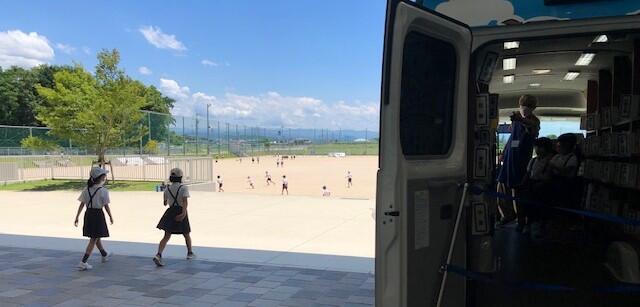 昼休み、みんなの玄関から運動場方向を撮影しました。右に写っているのは、合志市の移動図書館「ひまわりドンちゃん号」です。