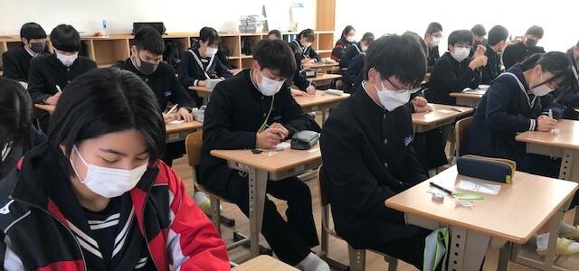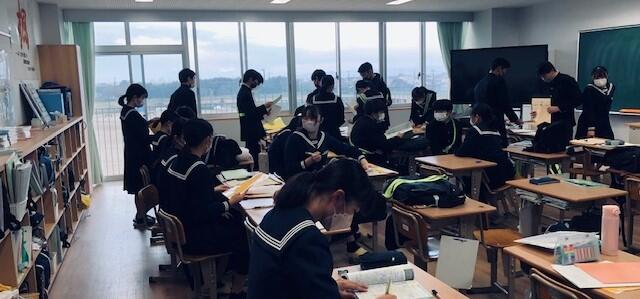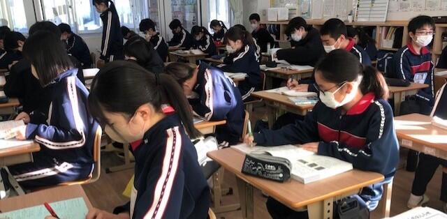 先週、新型コロナウイルスの陽性者が多く出てしまった1年1組ですが、現在はほぼ元の出席者数に戻っています。数名の教室にいない生徒は、別室で熊本県学力学習状況調査を受検しています。