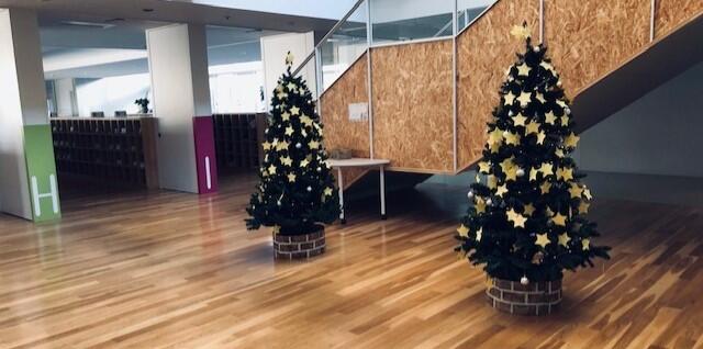 1階の西側ロビーには、小学校の方で飾っていただいたクリスマスツリーが飾られています。☆に書いた願いを見てみると、やはり新型コロナの終息を願う言葉をたくさん見つけました。小学生もまた、世の中の平和や幸福を願っているんだなと思います。また、小学校の先生方は、このように飾り付けや掲示が上手なので、校舎内の雰囲気が明るくなって、これも小中一体型のメリットですね。