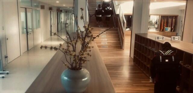 みんなの玄関から東階段方向を撮影しました。手前の花瓶には、いい香りがする「蝋梅(ろうばい)」を生けています。生けてからもう2週目になりますが、坂本 先生が小まめに水切りしていただくので、枯れるどころか蕾も次々に肉厚のある黄色い花を咲かせています。