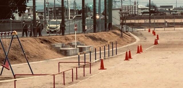 職員室からグラウンド(小学校用トラック)の方向を撮影しました。本日は、小学校で「合志楓の森記録会(小学校HPはこちら)」いわゆる持久走大会があります。運動場の三角コーンはそのコース設定のためのものです。中学校でも、昔は持久走大会が普通にあっていましたが、授業時数確保の厳しさなどの理由で、現在も実施されている中学校は少数です。走るのが苦手な生徒たちにとっては、ありがたいかもしれませんが‥‥。