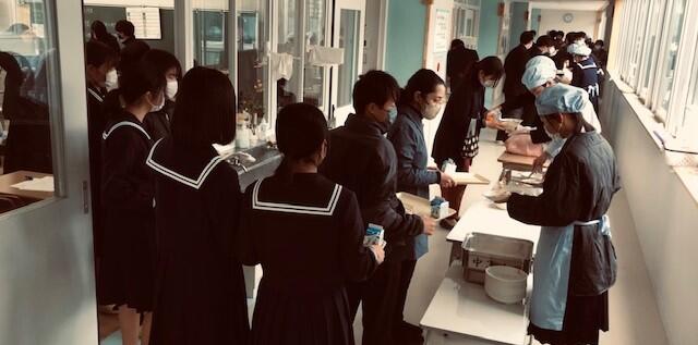 3年教室前で、給食の準備をしている3年生の様子を撮影しました。