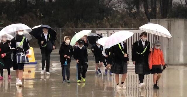 職員室から東門方向の傘をさして登校する児童生徒の様子を撮影しました。「三寒四温」という言葉がありますが、これからは一雨毎に気温が上がり春が近づいてきます。3月3日(金)の卒業式当日は、「四温」の方に当たればいいなと思っています。